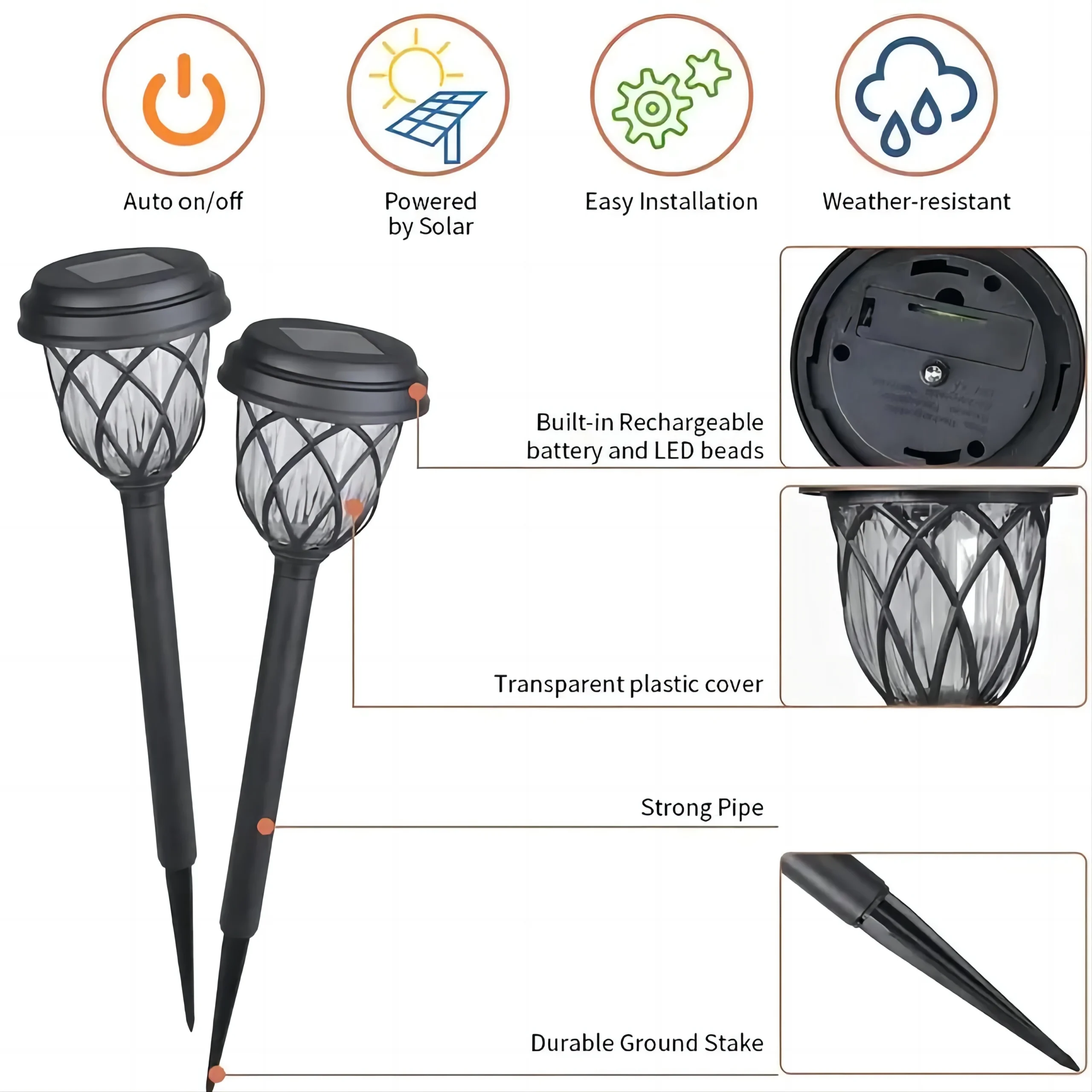 Decorative solar lights for walkways, driveways, and gardens,